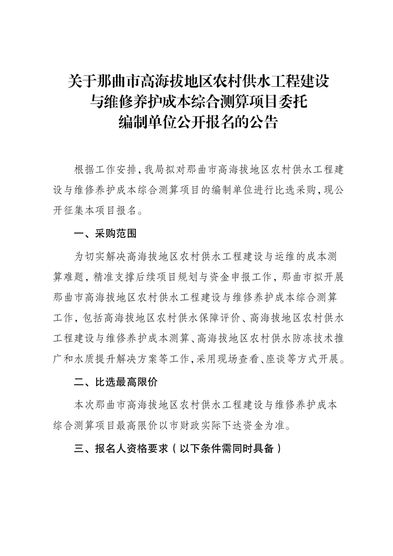 关于那曲市高海拔地区农村供水工程建设与维修养护成本综合测算项目委托编制单位公开报名的公告