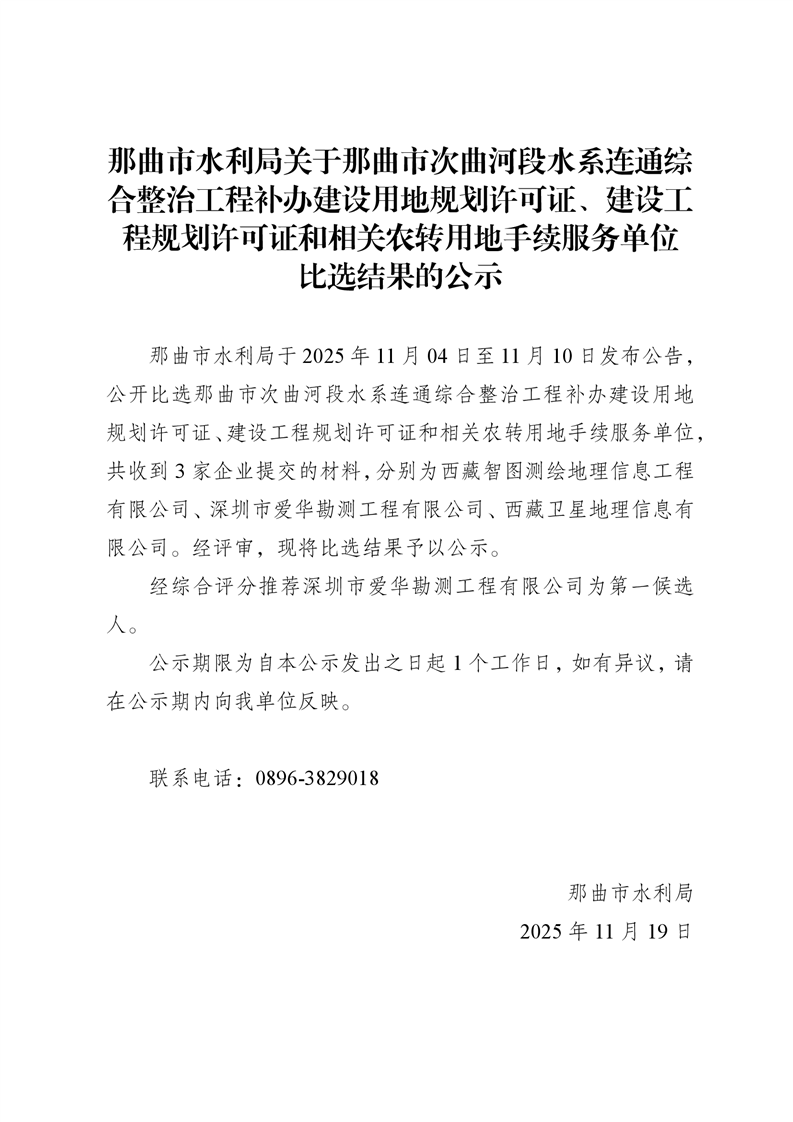 那曲市水利局关于那曲市次曲河段水系连通综合整治工程补办建设用地规划许可证、建设工程规划许可证和相关农转用地手续服务单位比选结果的公示